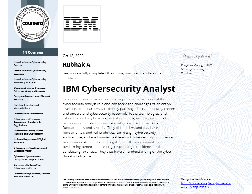 Learnt an in-depth program covering key cybersecurity domains including threat intelligence, network security, incident response, and SIEM tools. Gained hands-on experience with IBM QRadar, Linux, and key frameworks like NIST and MITRE ATTACK.