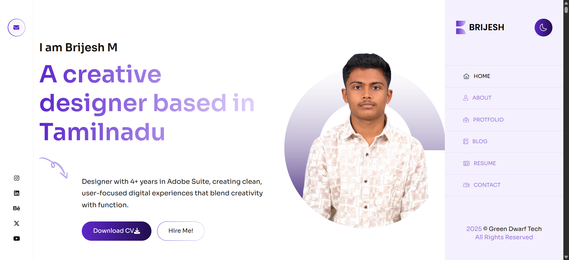 • Hero Section – Personal introduction, photo, and social links