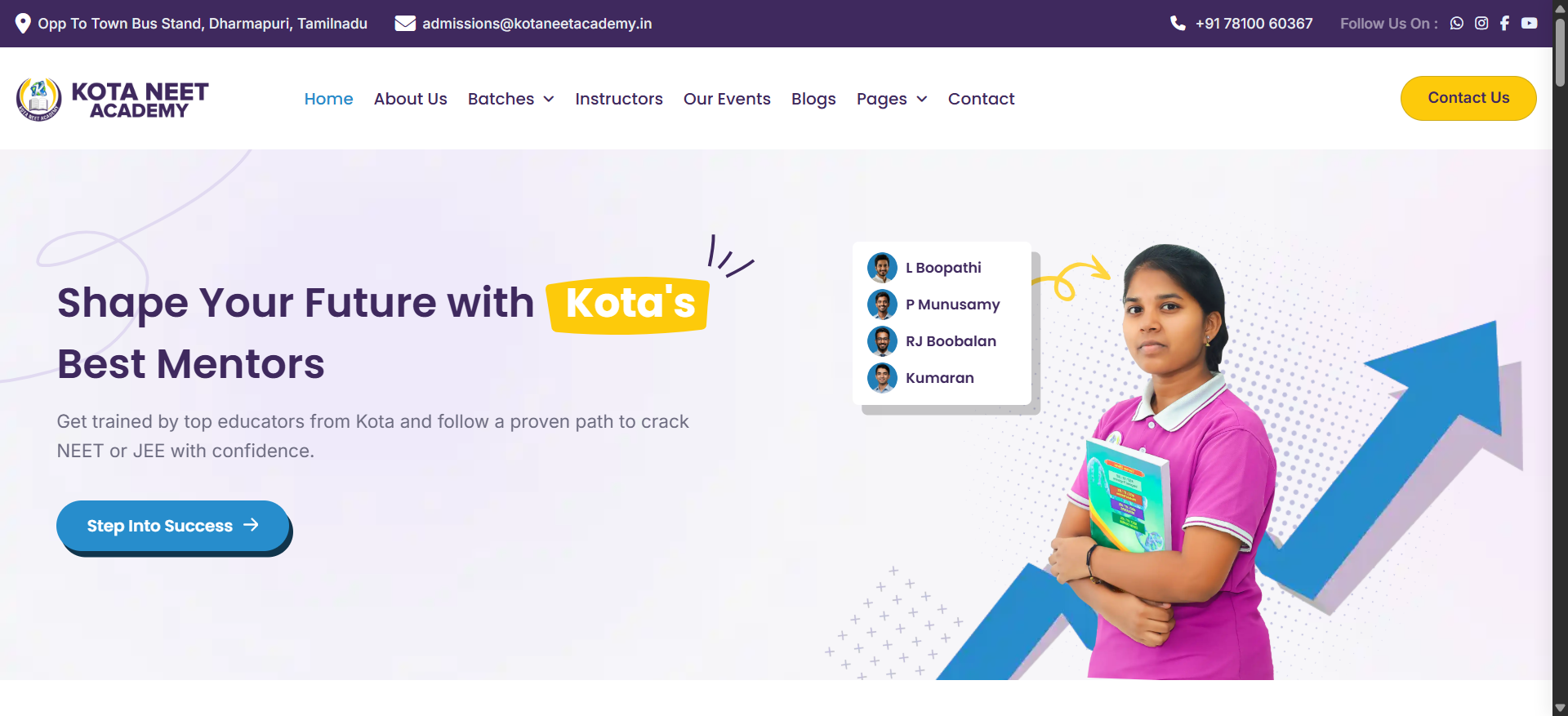 Kota NEET Academy operates from Dharmapuri, Tamil Nadu – a hub inspired by the coaching legacy of Kota, Rajasthan. The site had to reflect its commitment to quality mentorship (“Get trained by top educators from Kota’s proven legacy”) and attract NEET and JEE aspirants through clear messaging and user-friendly design. Our mission was to create a professional, responsive website that showcased their batches, instructor profiles, events, student success, and FAQs – all without bloated frameworks.